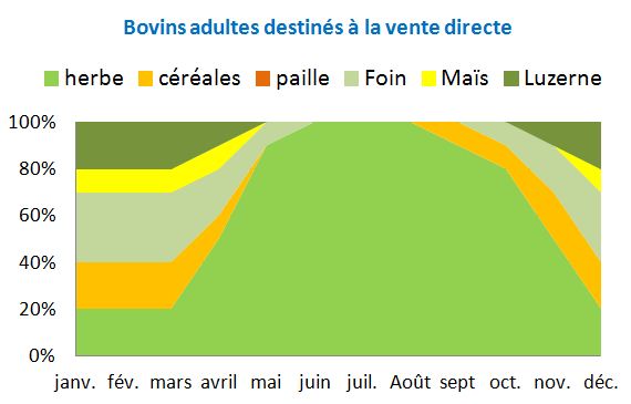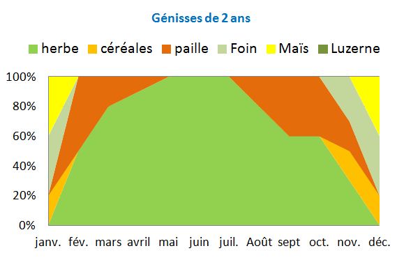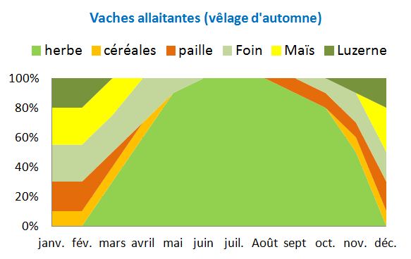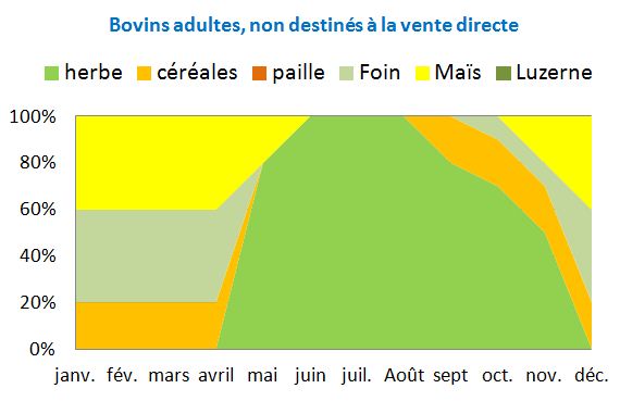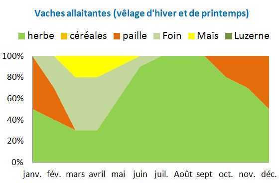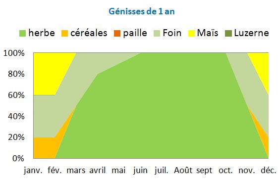 Les couleurs correspondent à un type de fourrage: céréales, foin, herbe, luzerne, maïs et